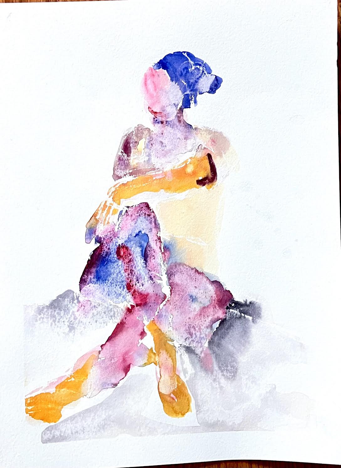 Watercolor figure of woman in a half twist yoga pose by Mia Wenjen