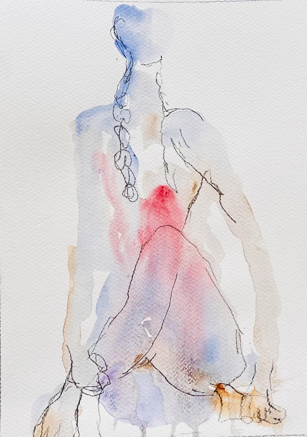 Watercolor painting with conte pencil of a seated woman in yoga pose by Mia Wenjen